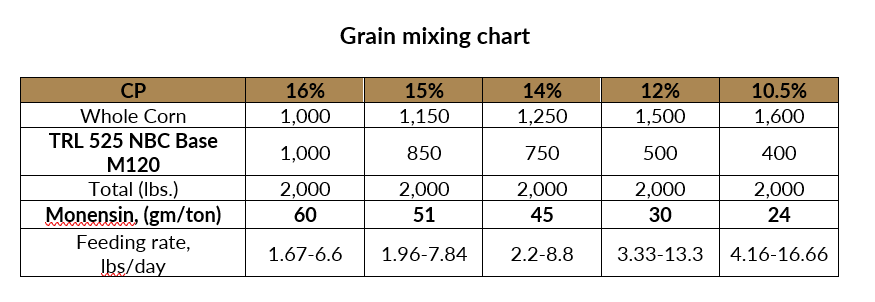 Tend-R-Leen 525 NBC Base M-120 is designed to be mixed with grains at the rate of 400 to 1,000 lb per ton, to produce rations for growing cattle. A source of free choice forage/roughage must be available at all times.